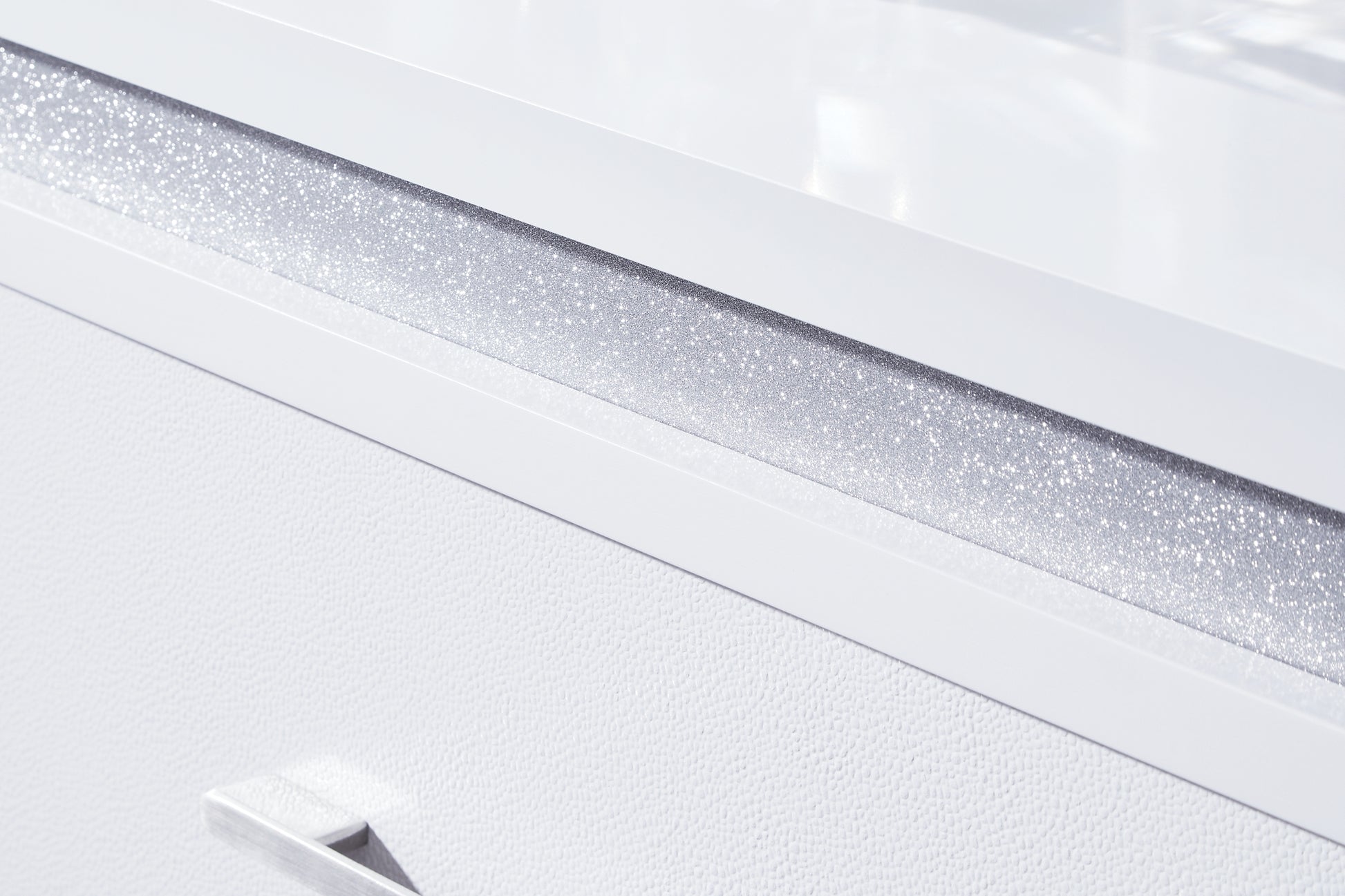 Details Made with hardwood solids and MDF substrates, White paint finish, Inset acrylic glitter accents, Horizontal metal drawer pulls, 4 drawers with fully finished interiors, dovetail construction and heavy-duty ball-bearing side glides, Textured drawer fronts